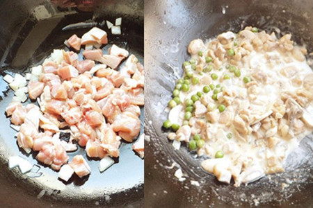 炒锅内加入适量食用油,烧热,油温稍微升高后,下洋葱粒煸炒。炒出香味之后,将腌好的鸡腿肉下锅,翻炒均匀。鸡腿肉炒至无血色之后,加入烫过的口蘑片,翻炒均匀。接着倒入适量淡奶油,加入豌豆粒,炒匀,煮至汤汁略微收干,调入少许食盐,即可熄火。