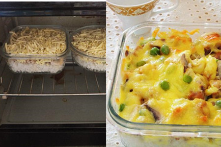 烤箱提前调至200度预热五分钟,五分钟后,把米饭送入烤箱中层,烤至芝士呈焦黄色即可。食材可以随意搭配,根据自己的口味来选择,烤制时间也可以根据个人口味来控制。【女物原创未经允许,谢绝转载!】