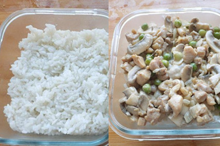 将米饭盛入烘焙碗里,用勺子稍微压平一点,铺上炒好的奶油口蘑鸡肉,汤汁也浇在米饭上,再撒上芝士。
