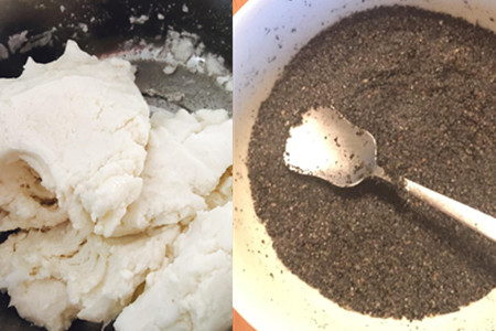 汤圆的做法则是要温和许多,先需要把馅料制做出来。取30克的熟芝麻粉,黑白无所谓,这个看个人喜好。然后在取芝麻粉两倍分量的白砂糖,馅料要想好吃,必须要保证糖的分量,过多也不好,会比较腻。把两者放入盆内,倒进30克的猪油,这种猪油一般在大型超市都可以买到。不需要加清水,就是要用猪油把两者搅拌均匀,像揉面一样揉捏。
