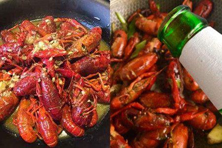 step5:接下来,该轮到啤酒出场了。加入适量事先备好的啤酒后再放入小龙虾,煮五至七分钟左右即可享受美味!