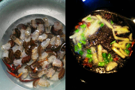 step5:往锅中加入适量的啤酒,翻炒直至产生香味后加入葱花。