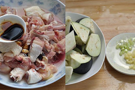 鸡腿洗干净剁成小块,装入盘中,加一汤匙料酒和半汤匙酱油,用手拌匀,腌制三十分钟。长茄子洗干净,随意滚刀切成小块,葱姜洗干净切成末。