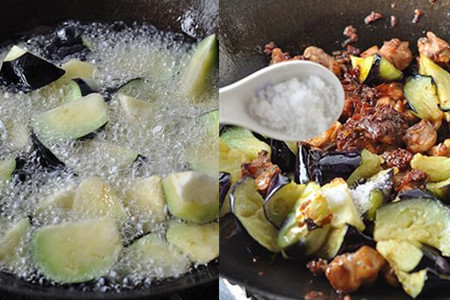 炒锅内倒油,量要多一些,开火加热至七成,把茄子滤干水分后下锅炸制,茄子的表面变成有点变黄后,捞出锅,控掉多余油分。鸡肉腌好后,也下油锅炸制,炸成金黄色后,捞出控油。