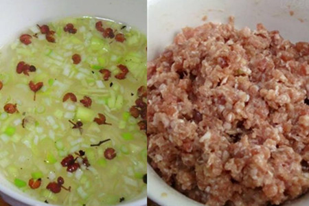 把葱末和花椒粒放在同一个碗里,加适量热水泡开,自然冷却待用。猪肉馅加适量香油和姜末,用筷子按着同方向搅拌,搅拌片刻后,加入适量花椒水和鸡蛋清继续搅拌,再加入适量干淀粉,搅拌均匀待用。