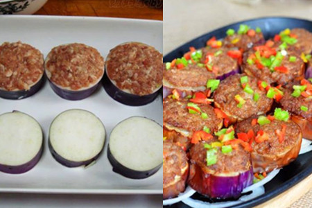 炒锅内倒油,烧热,将茄子没有肉馅的一面朝下下锅炸制,炸成金黄后,再翻一面,让有肉馅的一面朝下,炸制片刻后盛出控油。往准备好的铁板上刷一层油,烧热后放上洋葱,洋葱煎软后放上炸好的茄子,撒上青红辣椒碎装饰一下。锅内倒入少许油,下葱姜末爆香,加入适量的老抽、蜂蜜、料酒、淀粉、生抽和清水,搅拌均匀,煮开后淋在茄子即可。【女物原创未经允许,谢绝转载!】