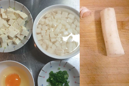 step2:对食材进行处理。你需要去除山药皮,将用沸水烫后的豆腐切成丁状,将蒜去皮后剁成蓉。
