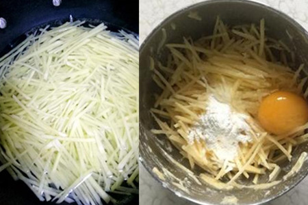 第三步,混合土豆和蛋液。土豆丝沥干水分需要很长时间,如果家中有吹风机,可以用吹风机将土豆丝稍微吹一下,水分吹干以后,将土豆丝倒入盆中,加入切碎的葱末,再将打发好的蛋液倒入盆中,加入适量的花椒粉和食盐,再加入适量的面粉,将盆中的食材搅拌均匀放在一旁静置五分钟,让土豆丝入味。