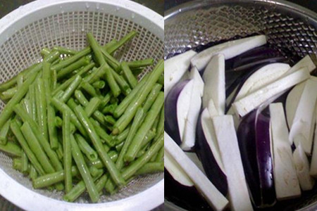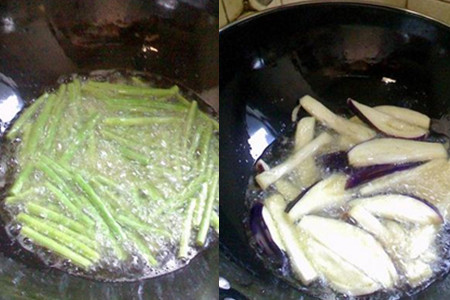 将锅中的油烧至6分热后再将沥干水分的豇豆倒入锅中炸熟,炸的时候用筷子搅拌一下让豇豆受热均匀。炸好豇豆后捞起来放在篮子里沥一下油分。将切好的茄子放入油锅中稍微炸一下,茄子吸油,炸一下味道更好。炸好以后捞起来同样放在篮子里沥油分。
