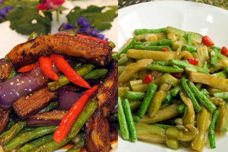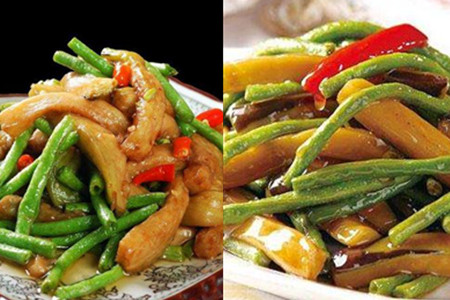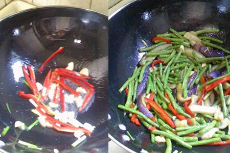 第四步,炒制豇豆茄子。将锅中的油倒出来留一点点底油在锅中,将切碎的生姜大蒜和红椒倒入锅中翻炒,红椒炒制绵软以后将沥干油分的豇豆茄子倒入锅中,加入适量的食盐和蚝油,大火翻炒均匀,让菜贴着锅壁稍微煎一下后加入适量的鸡精,撒上一点清水,再翻炒几下就可以出锅了。