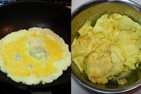 将煎好的鸡蛋用锅铲翻炒一下,打散蛋饼,让它变成细小鸡蛋块,撒上一点食盐,翻炒一下鸡蛋块就可以出锅了。