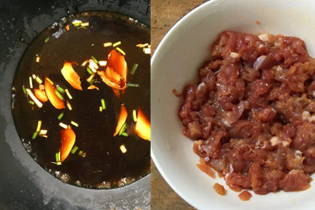生姜洗净切成片,葱白切成段,倒入干净的炒锅里,调好的酱汁也倒入炒锅里,把炒锅置于灶上,开小火煮五分钟。五分钟后,捞出姜片和葱段扔掉,把酱汁盛入碗里待用。葱叶洗干净剁成碎,瘦肉洗干净切成颗粒状,装入碗里,加适量生粉、盐和生抽,用手拌匀,腌制几分钟。