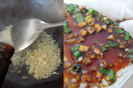 炒锅上灶,倒入适量油,开火烧热,油热之后,下大蒜末煸炒。炒出蒜香味之后,烹入适量酱油,熬煮片刻,再撒入香葱即可关火。从蒸锅里取出蒸熟的肠粉,将煮好的香葱蒜末酱油汁淋在肠粉上即可食用。