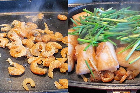 双面锅提前预热,加入适量的橄榄油,油温升高之后,将泡软的虾米下锅煸炒。虾米炒至稍微变干之后,用铲子将其拨到一边,放入切好的肠粉和姜丝煎制。中途不停地翻转肠粉,将其两面都煎成金黄色。肠粉煎好之后,淋入调好的酱汁,加盖焖煮至酱汁收干。酱汁收干之后,打开盖子,香葱洗干净切段下锅,将葱段炒至发焉即可熄火。