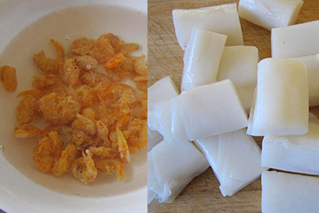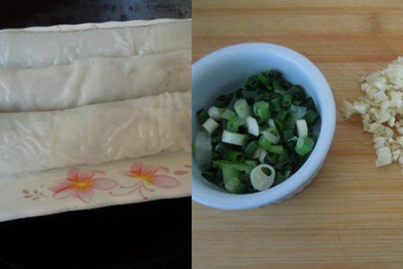 食材:肠粉500克、虾米80克、橄榄油、鱼露、白糖、胡椒粉、姜、葱、生抽。