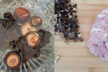 提前把黑木耳和香菇泡软,清洗干净,剁成末。猪扒肉洗干净剁成末,生姜洗净切成末。