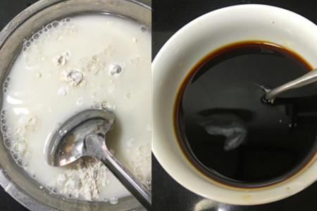 将准备好的粘米粉、澄粉和淀粉装入同一个盆里,混合均匀,调入400克清水和适量食盐,用勺子搅拌至无颗粒状态。取一个小碗,加入适量生抽、蚝油、白糖、老抽和清水,调和均匀备用。