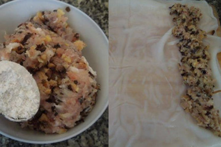 将木耳末、香菇末、猪肉末和姜末一起装入碗里,加适量地瓜粉、鸡精、酱油,搅拌均匀备用。将一块肠粉平铺开来,把调好的肉馅整齐地码在肠粉上,再从一端轻轻地卷起来即可。