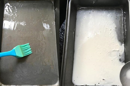 锅里倒入适量清水烧开,在烤盘上涂上食用油置于开水之上,粉浆搅拌均匀倒入烤盘,晃匀。