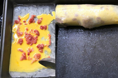 将腌好的肉粒均匀地撒在粉浆上,鸡蛋打散倒入烤盘,晃匀,加盖蒸三分钟。三分钟后,打开盖子,均匀地撒上葱花,用铲子刮起肠粉,再卷起来,把肉馅裹住,装入盘里,浇上适量酱油和香油即可。每次舀米浆的时候,都要用勺子把米浆拌匀再舀。【女物原创未经允许,谢绝转载!】
