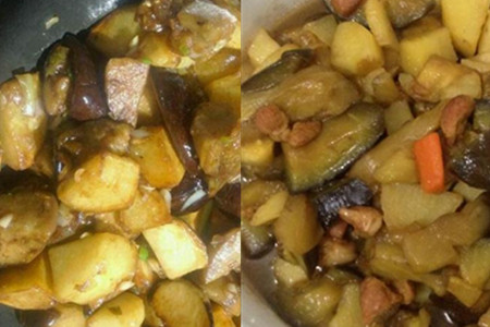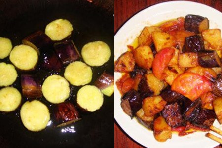 第四步,炒制茄子土豆。将锅中的油倒出来留一点底油就可以了,开大火烧,将切碎的生姜大蒜倒入锅中翻炒,再倒入切好的茄子,将茄子稍微煎一下,煎黄以后将切好的西红柿倒入锅中翻炒,加入适量的食盐、胡椒粉和酱油,翻炒均匀以后往锅中倒入适量的水,再将炸好的土豆倒上去,盖上锅盖焖煮3分钟。焖好以后撒上适量鸡精,翻炒均匀就好了。