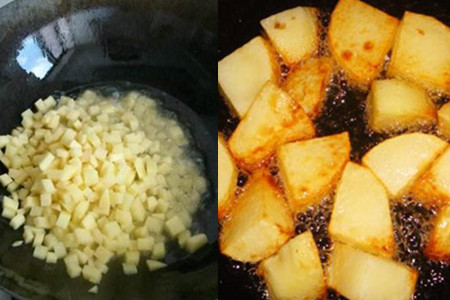 将土豆去皮后放在水盆中稍微洗一下,然后切成大小适宜的丁块。将切好的土豆放在清水中浸泡十分钟洗干净表面的淀粉,防止土豆氧化变色。