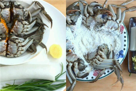 将新鲜河蟹清洗干净,重点清洗蟹螯和蟹盖。洗干净的河蟹去除蟹盖,将河蟹里的鳃和消化腺摘除,将河蟹从中间一剁为二。在河蟹切面处抹上干面粉,这样可以防止蟹黄流出来。