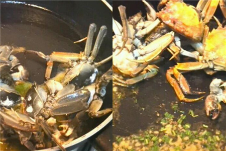 将油锅加热后加入河蟹块、料酒、葱末和姜末一起进行翻炒,等河蟹颜色由墨绿色变成红色的时候加入少量的清水焖上一会儿。