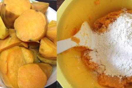 步骤2、煮熟后用勺子或者是铲子,将它压成泥状,随后放入白糖和面粉。(白糖可以根据个人的口味下,但不要下太多,因为地瓜本身就是带有糖分的,再多就太甜了)