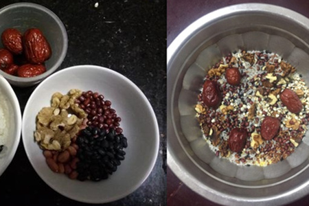 1.提前一个晚上,用冷水浸泡红豆,使红豆变软比较好煮;提前两个小时,用冷水浸泡黑米和糙米。