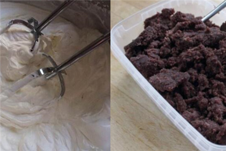 奶油馅:将淡奶油和白砂糖放入打蛋盆中,用电动打蛋器高速打发。等奶油由液态变成固态就可以了。