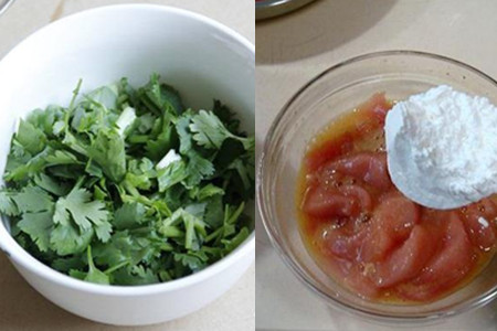 第二步,处理食材。将香菜去掉黄叶和根须放在水盆中,倒入适量的清水,加入一点食盐,搅拌一下,让香菜浸泡20分钟,一来可以杀菌,二来可以去除香菜表面的农药残留。将浸泡好的香菜捞起来放入清水盆中再清洗一下,去一去盐分后就可以捞起来了,再将香菜稍微切短一点就可以就可以了。