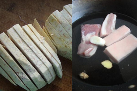 第二步,处理食材。将芋头整个放在清水中清洗干净表面的泥沙再用刨刀将清洗干净的芋头外皮刮干净,将刮干净的芋头放入清水盆中浸泡清洗干净。芋头去皮后很容易沾上脏东西,而且沾上以后就不容易清洗干净,所以要放在水中浸泡清洗干净。清洗干净以后将芋头切成薄片备用。