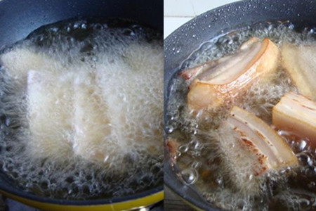 第三步,炸芋头和五花肉。将锅中的水倒掉后擦干净,大火将锅烧热,倒入多一点的食用油,待锅中的油烧至5分热的时候就可以开始炸芋头和五花肉了。将芋头和五花肉分批分别倒入锅中炸,它们炸熟的时间不一样,所以不能混合一起倒入锅中。将五花肉表面榨至金黄色就可以捞起来了。