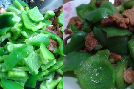 第四步,青椒炒肉。往锅中继续加入适量的清油,将切成碎末的生姜大蒜倒进去翻炒,有香味以后将切好的太空椒倒入锅中,大火翻炒。太空椒不是很容易熟,所以炒的时候要多炒一会儿,炒绵软以后再炒1分钟,再将炒好的肉片倒入锅中,喷洒上一点水,翻炒均匀后焖半分钟,待锅中的酱汁收得差不多了就关火。