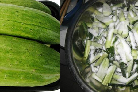 黄瓜买来后,用清水清洗干净,然后放在案板上,用菜刀切成一厘米左右宽度的黄瓜条。切的过程中会出很多水,无需担心,我们有秘密方法去除多余的汁水。切好的黄瓜条放在一个干净的盆里,然后撒上适量的精盐,再添加一些清水。开始不用加其他的调料,只需要用盐水腌制就可以,腌制的时间需要一天一夜,味道才会很好的融入到黄瓜里。