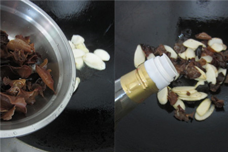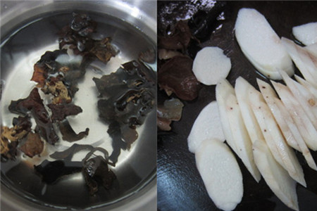 1.将黑木耳提前1个小时浸泡,这样才可以清洗干净。洗干净后的木耳我们用手把它弄成小块,要是觉得这样不好看的也可以切丝。山药去皮切片,不要切太薄,否则炒的时候会碎的。山药切好之后我们先用水泡着,否则会变色,这样后不好看了。