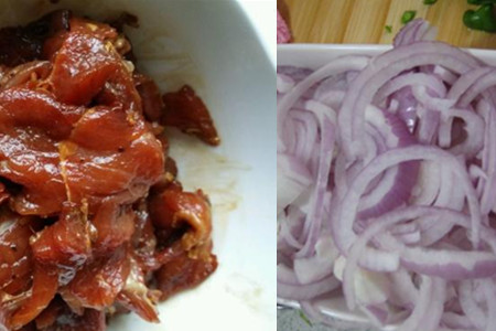 3、把豆芽的根部不能食用的部位择去,放在淡盐水之中浸泡几个钟头,这样可以去除上面的杂质。把洋葱剥皮,洗净后用刀切成细丝。