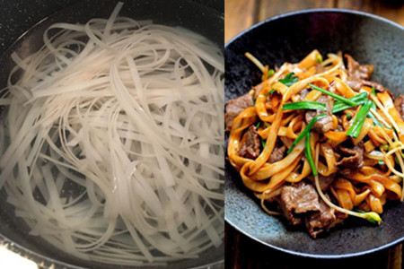 4、用开水将河粉泡软,泡至其完全变成白色后,捞出沥干多余的水分,放在一旁备用。
