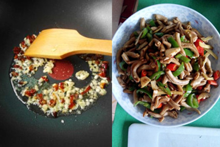 3、在炒锅之中,倒入些许的油。油温加热到七八成时,把蒜末、辣椒段进行翻炒爆香,待其香味全部散发后。把鸡肠下入油锅之中,大火进行翻炒,淋上些许的米酒和生抽使鸡肠充分吸味。