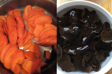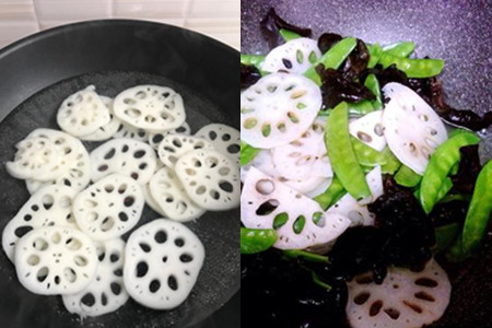 2、先将胡萝卜削皮,洗净后用刀切成薄片。荷兰豆去除筋部,放在水龙头下清洗干净。把莲藕削去外皮,用刀切成薄厚适当的片状。木耳事先放在清水之中泡发,泡发后用手撕成块状,放在一旁备用。