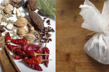 将卤料中的香料先放入清水中浸泡半个小时(去除香料中的苦涩味),然后用纱布包扎起来做成香料包。