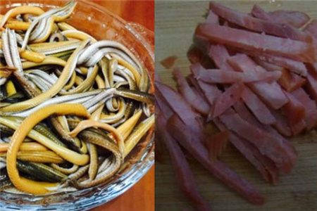 将鳝鱼放血去内脏和骨头,留下的鳝鱼肉切成鳝丝。火腿和冬笋也切成丝,生姜和大蒜切成末备用。