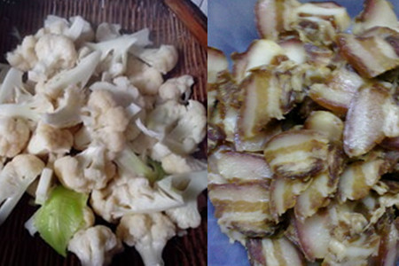 将花菜切成一块块,这样在翻炒的时候方便入味。腊肉需要将它切成薄片状,然后将它放入锅中,用开水焯一下去除上面的烟熏味道。还需要准备一些辣椒、大蒜。