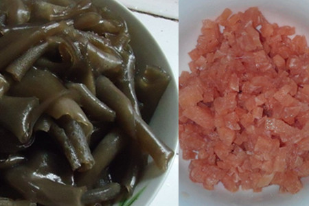 先用开水将荷折皮泡软,然后捞出来放进开水中。买回来的新鲜猪肉将它剁成碎末,加入一些盐、生抽,腌制一下,这样翻炒出的味道才会更加的好。还要准备葱、辣椒,都需要切碎。