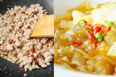 等到锅中的汤汁出现收汁的情况,就可以加入之前炒好的猪肉末,倒入一些酱油进去让菜上色,还需要加入适量的盐、鸡精,然后将这些调味品翻炒均匀就可以吃了。