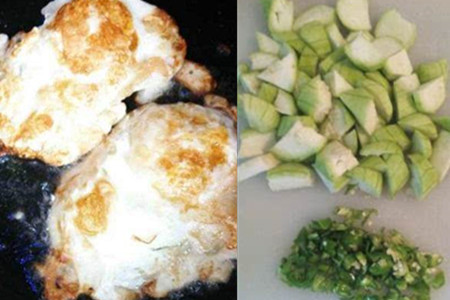 丝瓜削皮以后切成大小合适的块状,还需要切一些青辣椒、大蒜末。准备好鸡蛋,将它放入油锅里面煎成双面金黄色的荷包蛋,然后将鸡蛋盛出来放入碗中。