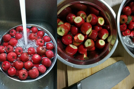 制作山楂酱,当然就少不了新鲜的山楂啊。购买新鲜的山楂,用清水浸泡半个小时左右,将一些杂质和虫子泡出来,并清洗干净。接下来用小刀将山楂两头切掉,将骨核取出来。这一项工作量巨大,需要时间和耐心,而且很不小心就会刀划伤手,所以一定要小心谨慎。