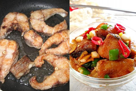 3、在炒锅中下入些许的食用油,油温烧热到七八成时。把鱼块逐一加入油锅之中,将其煎至两面金黄即可铲出放在盘中。