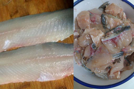 3、把处理好的草鱼用刀横切成两片,将鱼骨剔除,用刀剁成大块,放在一旁备用。把剩下的鱼肉切成薄片,一定要顺着鱼的纹路切。往鱼片之中逐一加入淀粉、胡椒粉、蛋清、料酒用筷子进行充分地搅拌,放在一边腌制大概半个钟头。